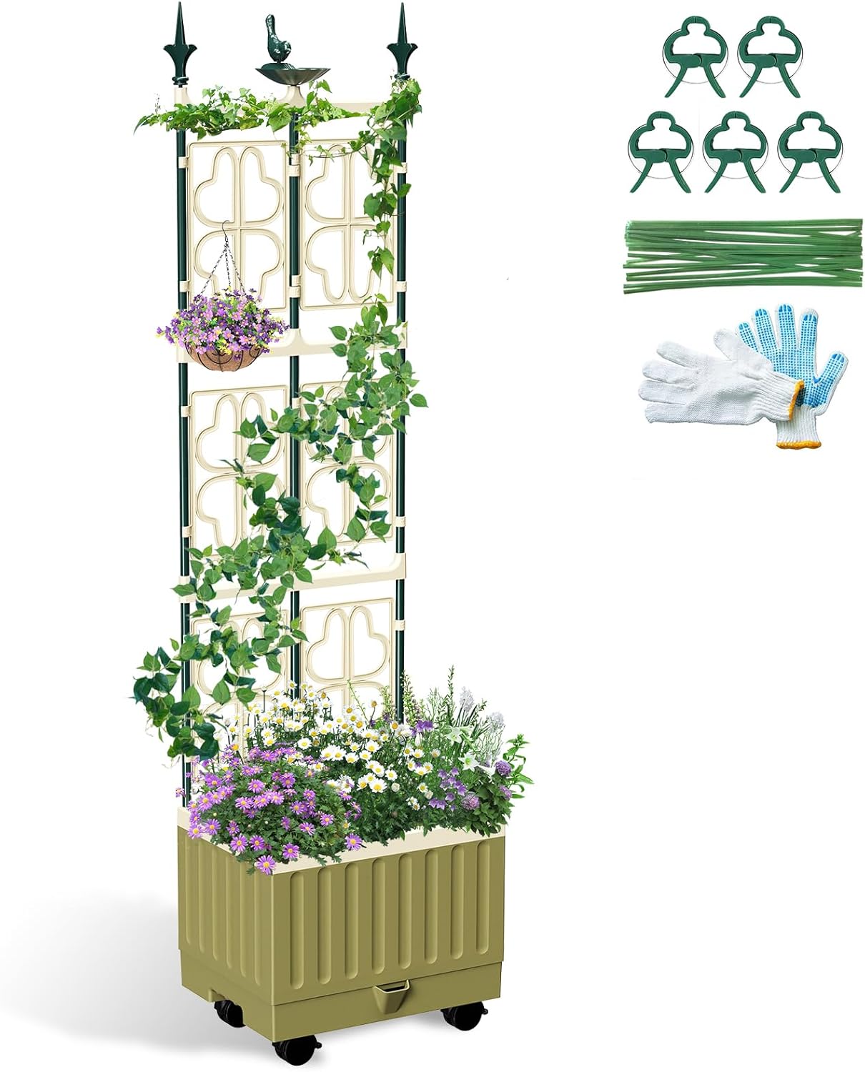 5.1Ft Tall Planter Box with Trellis,Self-Watering Tomato Planter Raised Garden Bed with Lockable Wheels & Drainage Hole for Outdoor Plants Tomato Flower Vegetable Herb Vine