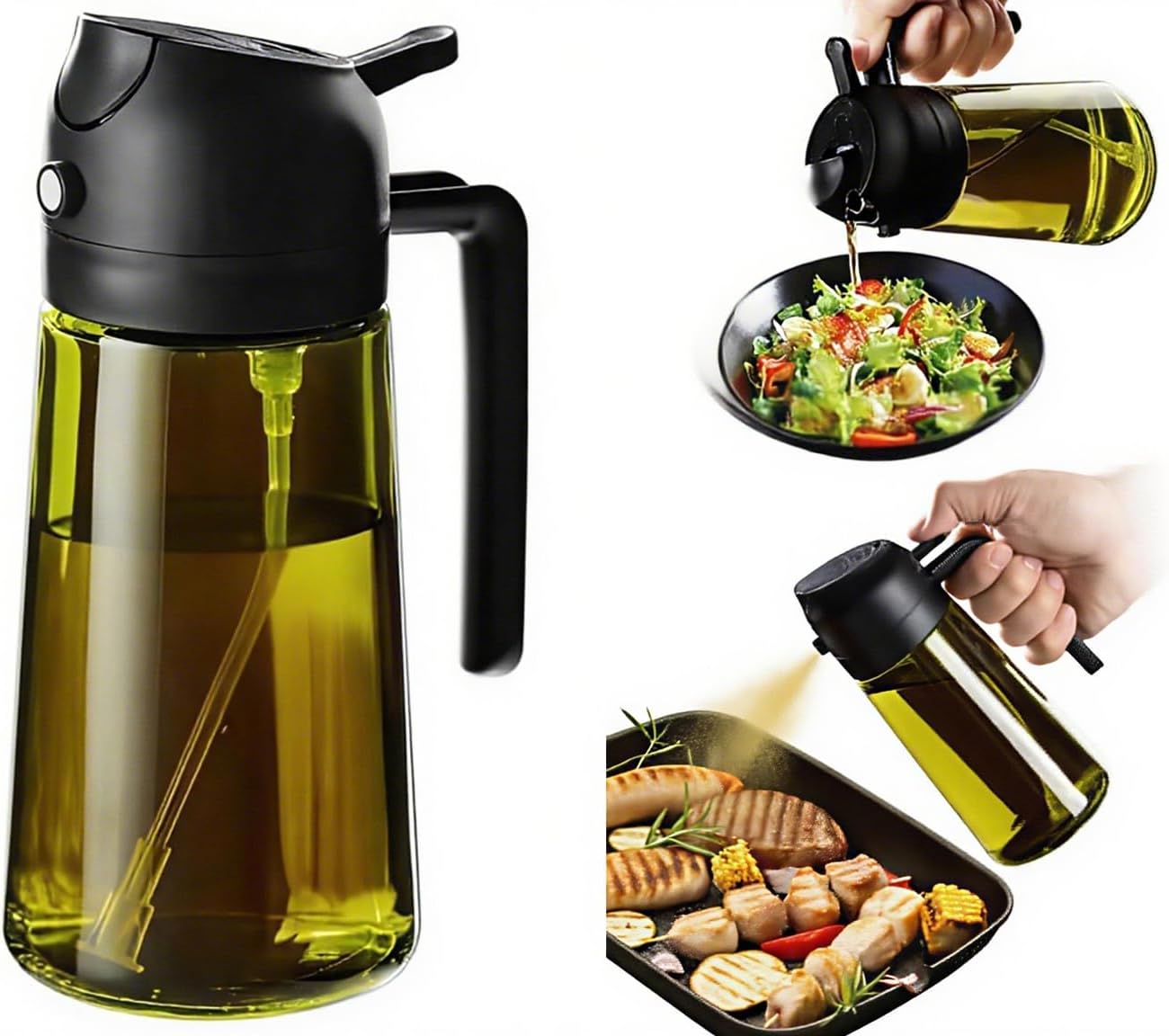 16oz/470ml Glass Olive Oil Sprayer for Cooking – 2 in 1 Olive Oil Dispenser Bottle for Kitchen Gadgets and Air Fryer Accessories, Salad, BBQ – White