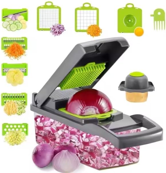Vegetable Chopper and Slicer, 15-in-1 Manual Food Dicer with Container, Stainless Steel Blades, Gray and Green