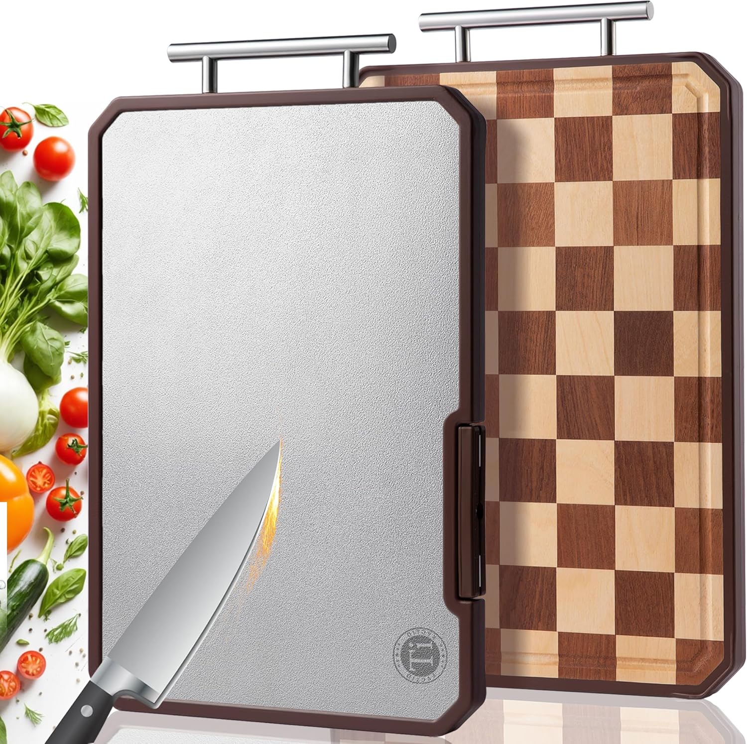 Titanium Cutting Board with Knife Sharpener, Pure Titanium & Wood Cutting Boards for Kitchen, Double Sided Checkerboard Chopping Board with Handle & Stand, 16.7”×10.4”