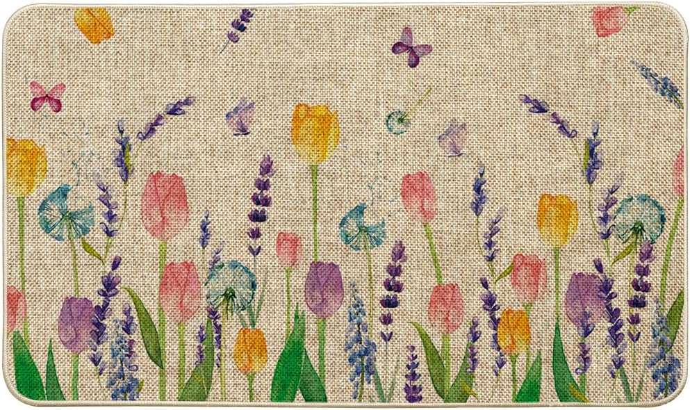 Tulip Lavender Spring Decorative Doormat, Seasonal Flower Summer Holiday Low-Profile Rug Switch Mat for Indoor Outdoor 17×29 Inch