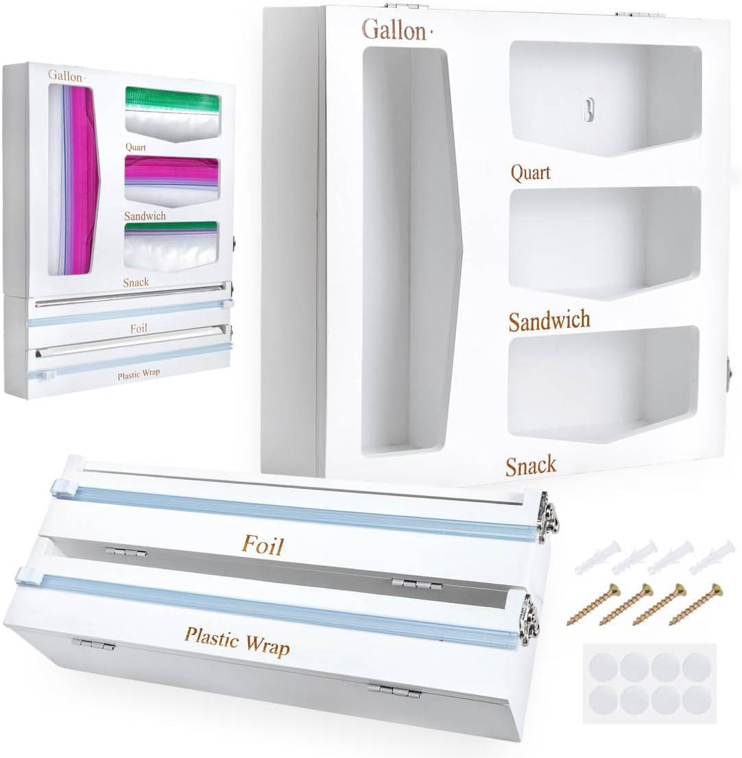 Storage Bag Organizer, Foil & Plastic Wrap Dispenser with Cutter, Organizer for Gallon, Quart, Sandwich &Snack Size, Bamboo Bag for Kitchen Drawer, White(17.5×3.5×13.5)