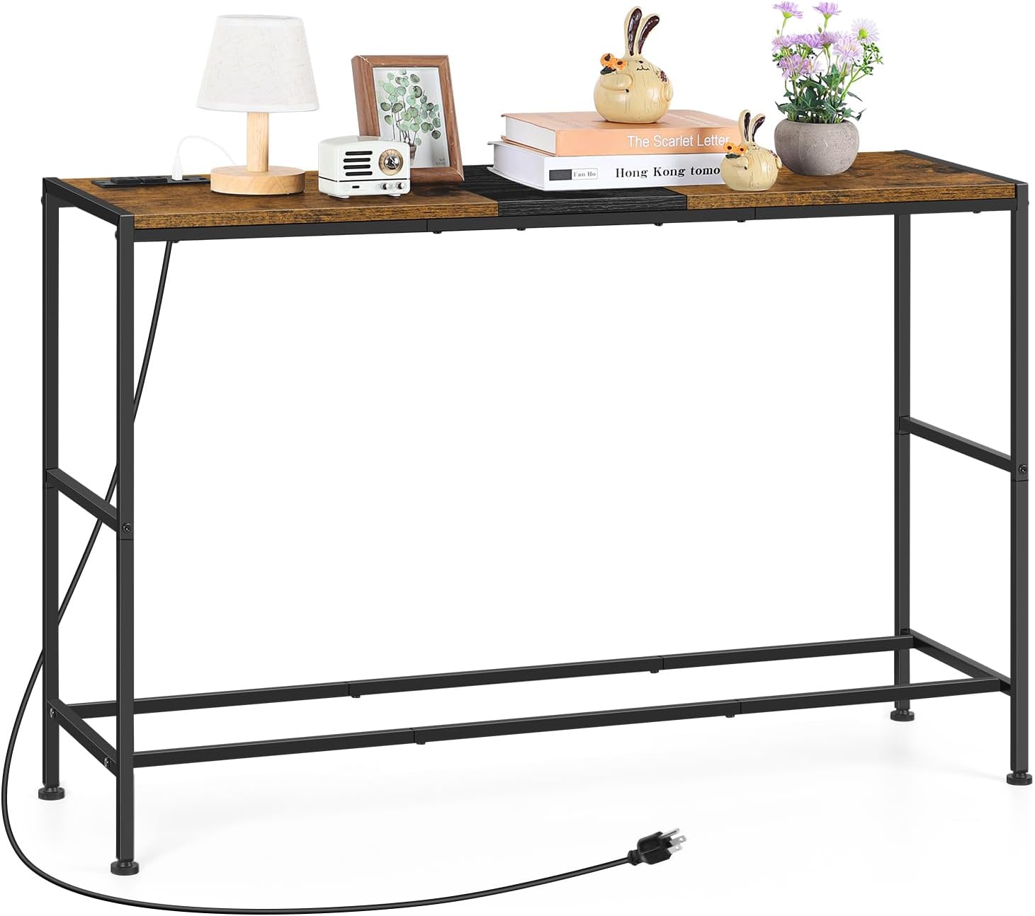 47.2 Inches Console Sofa Table with Power Outlets – Narrow Entryway Table with LED Lights – Skinny Hallway Table with Shelf – Behind Couch Table for Living Room – Rustic Brown